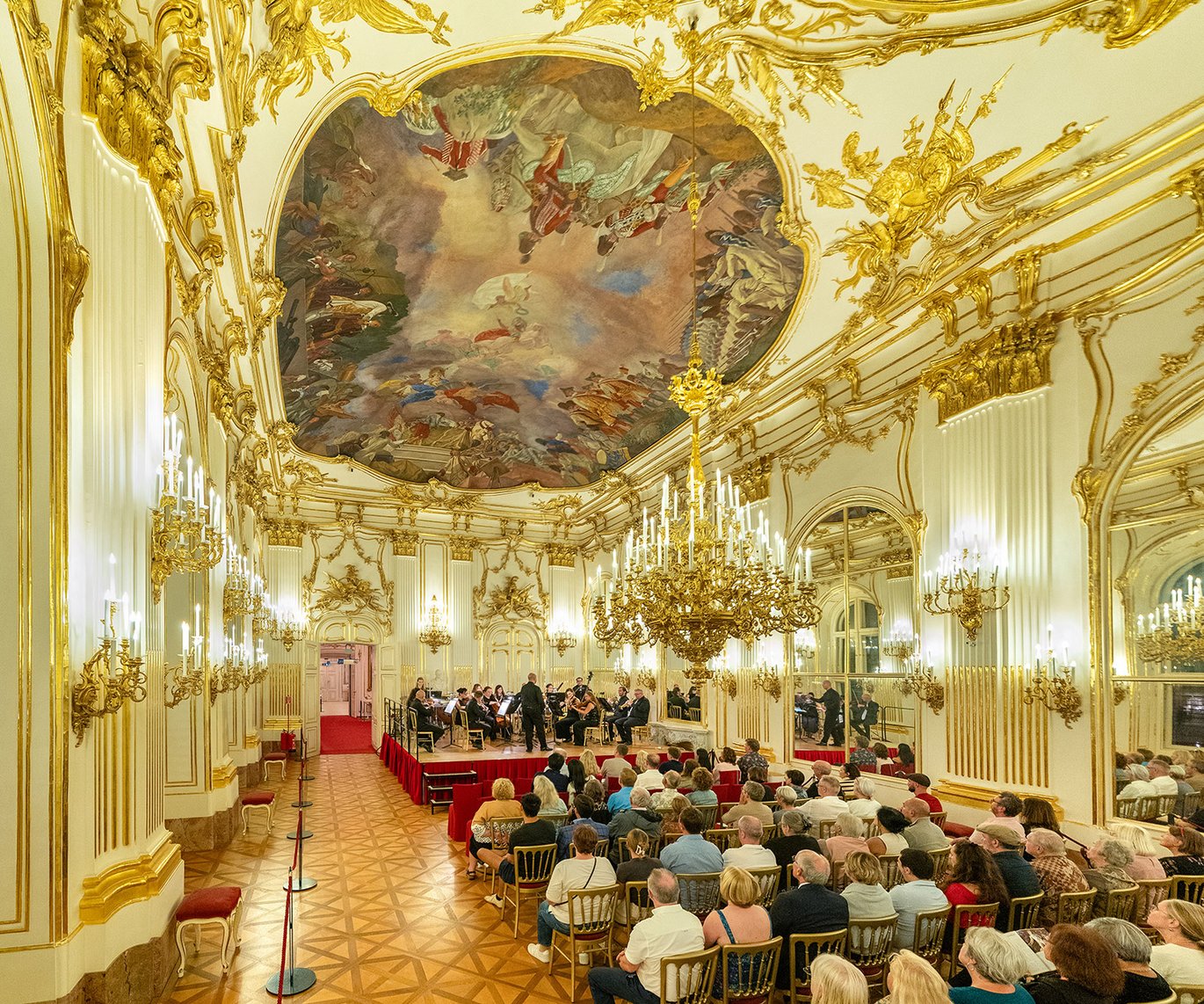 En fechas seleccionadas, los conciertos tienen lugar en la Gran Galería ubicada en el edificio principal del Palacio de Schoenbrunn. Con su ambiente imperial, la Gran Galería es el lugar alternativo ideal para los conciertos clásicos diarios.